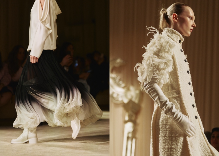 本季高定系列以「英国乡村」和「苏格兰高地」作为灵感,因此能发现自然色系贯穿了场地设计,与温柔的米白、象牙白、棕色、绿色、深黑等自然色调为基底色的服装,像是森林、雾气、沼泽地的延伸那般,呈现秋冬服装的静谧与细腻。
