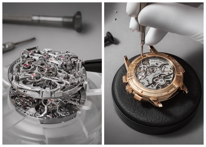 在方寸之间将复杂功能和优雅集于一身,Vacheron Constantin从不让人失望。Les Cabinotiers Temporis Duo Grand Complication Openface集合了三项复杂功能:三问报时(Minute Repeater,)、双追针计时(Split-Seconds Chronograph)与陀飞轮(Tourbillon),极考验钟表工艺的巅峰考验。腕表内置最新 Calibre 2757 S 机芯,共 696 个零件,兼容卓越性能与精妙构造,厚度仅 10.4mm,直径33.3mm。机芯采用精细化布局,特别设计的双追针计时板搭载创新材料,采用钛合金与镍磷电铸齿轮,以实现更流畅、更精准的齿轮啮合。
