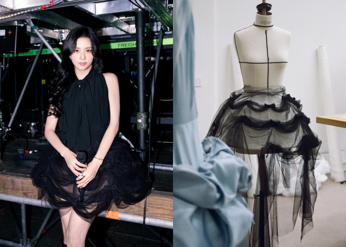第二和第三套正是Jisoo来到了巴黎场次,同样再次穿上Jonathan的特别定制款,黑色乔其纱上衣搭配层层蓬裙出现,经过堆叠制造出戏剧体积感却始终轻盈,在保有公主式的浪漫,又带有台风的硬朗支点,Q编自己也特别喜欢这套;另外一套粉色立体蓬裙亮相,和黑色造型形成两种截然不同的风格。