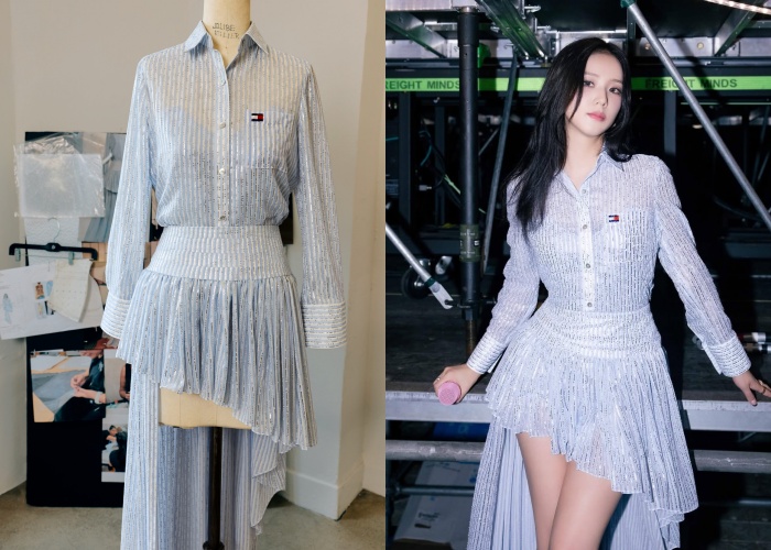 隔日换上另一套的是蓝白相间的Ithaca衬衫不规则裙装登场,采用透明丝绸雪纺制成,在Jisoo的每个动作间会发现服装上点缀的亮片和水晶在闪闪发亮,加上百褶细节不规则裙摆,显得特别活泼。