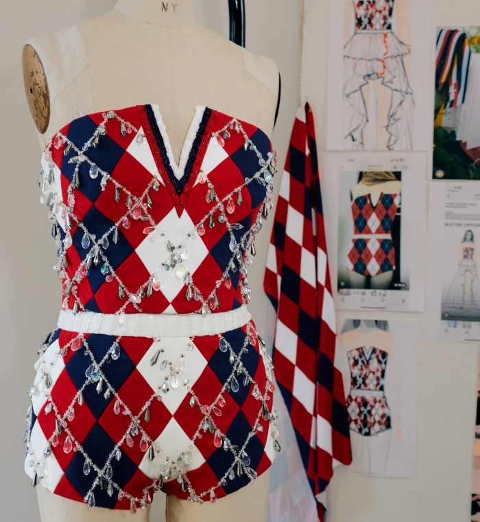 来到纽约场的Jisoo一改甜美浪漫,和Tommy Hilfiger 大有关系。品牌订制服以品牌标志红、白和蓝色调变融入到棱形图案中,将学院风风格做了新演绎。上面施以手工珠饰或微型水滴状装饰,随着舞台灯光与她的舞步闪动,产生「远看是色块但近看是工艺」的双重效果,让Jisoo在舞台上看起来格外俏皮活泼;