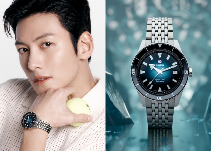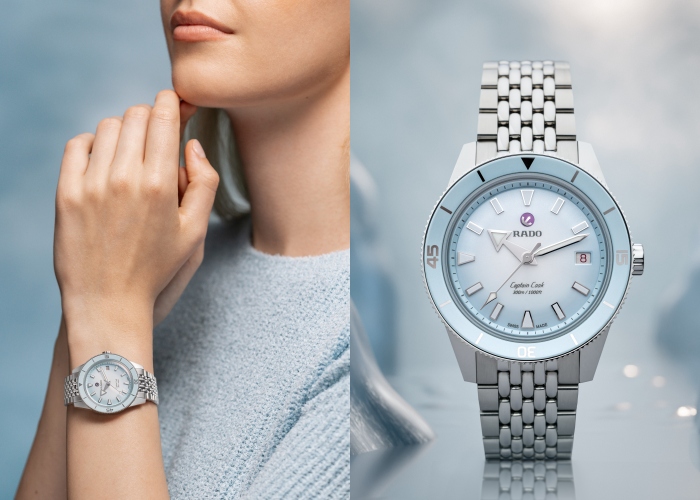 Rado推出两款全新Captain Cook系列腕表,以海洋诗意为灵感,展现截然不同的风格篇章。第一款浅蓝至白色渐变表盘搭配品牌首款浅蓝色陶瓷表圈衬片,让人想起圣巴特岛或塞舌尔的海面光影;另一款则以黑色到蓝绿色的渐变色调与黑色陶瓷表圈,流露出更具冒险气息的深海魅力。