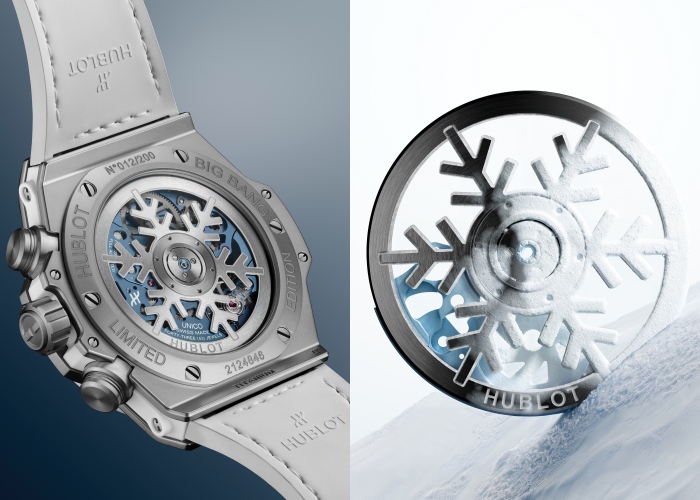 透过表背还能欣赏品牌精制的雪花造型摆陀,仿佛将冬日美好定格于腕间。可见Hublot不仅记录四季更迭,也礼赞季节之美。两款腕表均以冰雪灵感贯穿外观设计,银白色调与透明材质交织出不刻意却迷人的奢华感。金属表圈在手腕上映出柔亮光泽,既精致又干练,可说是气质女性的冬日首选。