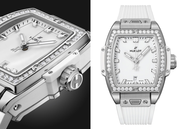 表圈镶嵌的 44 颗钻石散发细碎光芒,即使日常佩戴也不过分张扬,反而在举手投足间留下优雅余韵。白色表带搭配长方形酒桶造型表壳与哑光白色表盘,柔美与现代并存;搭载 HUB1120 自动上链机芯,提供 40 小时动力储存,非常适合喜爱低调奢华、欣赏精致却不过度张扬的女性。
