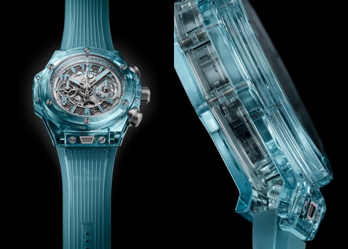 宛如水晶般剔透的蓝宝石表壳,是来自Hublot的大胆决定。品牌自十年前起便不断挑战蓝宝石材质的可塑性,研发出多种色彩,而水蓝色蓝宝石正是最新成果,轻盈却强烈,让人联想到热带海水般清澈迷人。