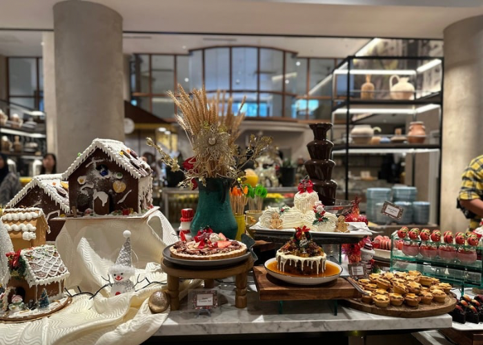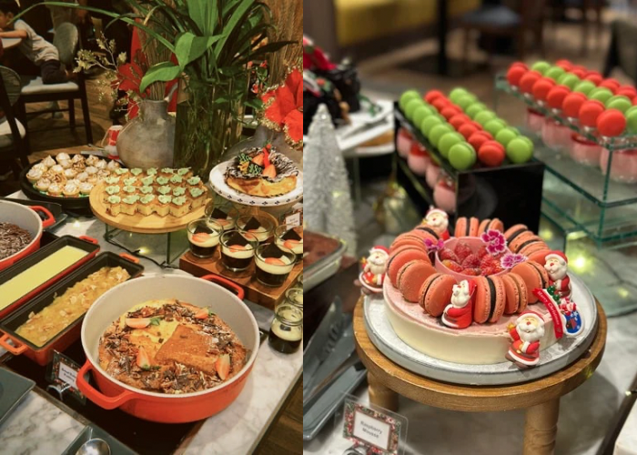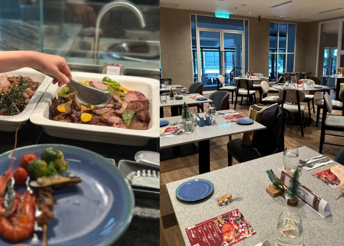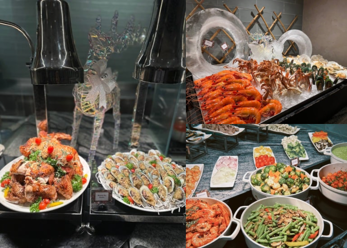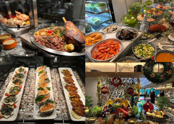 Q编这次来恰好与上酒店开始提供圣诞与跨年自助餐 ,丰富的菜色包括了充满圣诞气息的烤鸡、烤羊腿、焗芝士青口、鲜嫩烤牛里脊等,还有麦片虾、沙爹、葡式烤鱼等本地经典美食,现场还有即可料理的意大利面站和面档,让选择更丰富,可以满足更多人的味蕾。至于甜点区绝对是重头戏,汇集圣诞水果蛋糕、榴莲蛋白霜塔、树桐蛋糕、山核桃塔等节庆甜品,尤其看到甜点师精心布置成圣诞主题,真的还没吃就心情愉悦。除此之外,酒店也有特备的圣诞日下午茶、跨年夜庆典,届时还有现场乐队、DJ、专属烟火等与大家一起迎接2026年。