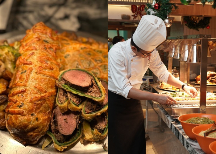 承袭酒店的宽敞大气,自助餐区的装饰和餐点同样充满仪式感,同时维持丰富精美,每个角落都充满年末的欢乐气息。从11月21日起,酒店率先推出招牌节庆预览,包括 圣诞与跨年自助餐 以及圣诞前夕豪华自助晚餐。Marriott 的节庆料理向来丰富,不仅份量足,味道也有水准,整体体验非常有诚意。圣诞节自助餐必不可少的全火鸡、Beef Wellington、烤羊肉,一上桌就成为焦点,前菜部分从烟熏三文鱼、海鲜冻盘、凯撒沙拉,到清爽的海鲜冷盘如青口与虾类都应有尽有。若选择圣诞前夕自助晚餐,体验感会更奢华,海鲜区加入扇贝与生蚝,汤品升级为海参蟹肉羹与野菇汤。