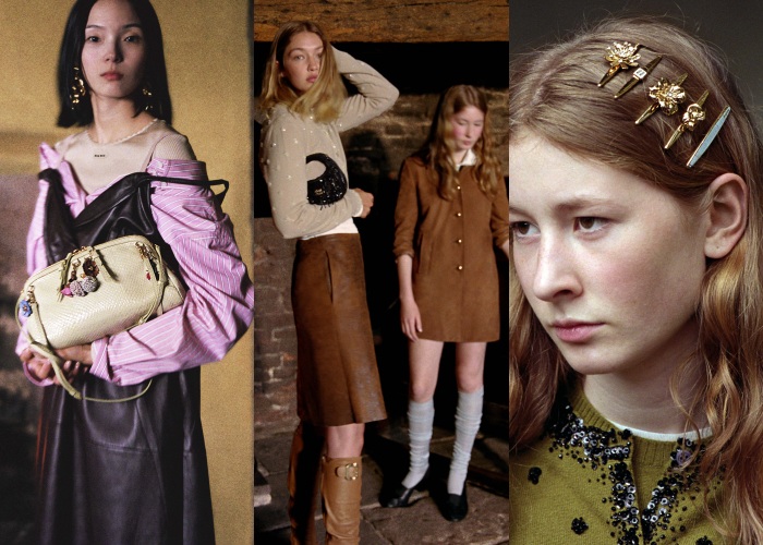 在庄园里庆祝年末假日会是什么模样?Miu Miu的2025假日系列大片满足了大家的想象。Miu Miu的拍摄场景以英国乡村的一座伊丽莎白时代庄园作为节日聚会背景,主要演绎的是熟悉的脸庞,有Gigi Hadid、Dede Mansro、Viola Sharp 和雎晓雯领,由Angela Hill 掌镜的这组大片采用 Super 8 胶片拍摄。可见柔和色调的皱褶刺绣公爵缎、拼接设计羊毛皮、缀有亮片和珠饰的针织衫、灵动的斜裁缎面、灵感源自内衣的弹力乔其纱与富有女性魅力的印花。经典莫卡辛软皮鞋、乐福鞋、拖鞋以及芭蕾鞋与及膝弹力皮靴、超平底运动鞋以及搭配罗缎装饰的尖头高跟鞋形成鲜明对比,为鞋履品类增添层次。手袋包括经典Wander、Arcadie、Pocket、Beau、Solitaire以及双肩背包,采用经典色彩,并为假日系列推出红色款式。
