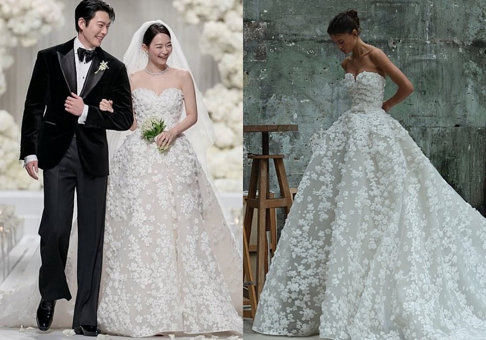 在率先发布的婚礼照片中,可见新娘申敏儿穿上了一袭被立体小花布满的白色婚纱,原来是出自黎巴嫩设计师Elie Saab2026年春夏新娘系列的作品。仔细看心形的领口以纱线、刺绣花案覆盖全件婚纱,再点缀上欧根纱花卉装饰,就像是在婚纱上绽放花朵般浪漫,远看似简单,实则细节都在考验剪裁、轮廓和精湛工艺的呈现。