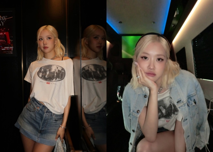 如果选择同色调的单宁也不怕,可以是不同颜色的上衣,或露腰短版T恤作为内搭,借此作出区隔,让整体视觉效果更丰富。Rosé就选择了短版上衣和宽松领口的T恤和单宁短裙做搭配,尽显出松弛感。