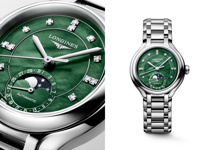 Longines 的PrimaLuna心月系列一向以女性化设计见长,而 Moonphase月相表则进一步强化其浪漫气质。深邃、优雅的深绿色表盘搭配月相显示,为时间增添一层诗意叙事。加上珍珠母贝的独有光泽,以及璀璨的钻石时标,使整体更显温润细腻。这是一种更偏向情感表达的绿色,既不张扬,却足够动人,仿佛将夜空与春日气息同时凝聚于腕间。