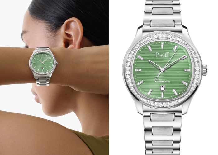 一向以纤薄制表与优雅风格著称的 Piaget,在 Polo 系列中展现出更为当代的一面。Polo Date 的绿色表盘采用横向饰纹装饰,在光线下呈现细腻的明暗变化,既不过分张扬,却自带存在感。延续其标志性的「外圆内方」枕形表壳,形成圆润与几何线条的对比感,展现运动与正装之间的微妙平衡。绿色在这里不再只是点缀,而是一种更内敛、成熟的风格表达,适合那些偏好低调奢华的佩戴者。