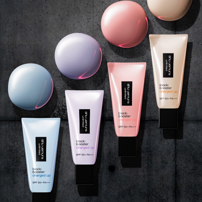 shu eumura 带来全新升级的unlimited block:booster charged up,运用专业光谱修色科技,专为亚洲肌肤精心调配四款修饰色调,能够精准校正不同肤色困扰,打造更匀净透亮的底妆基底。