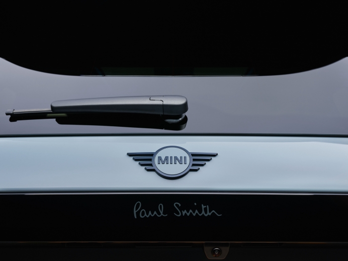 这款特别版车型配备 18 寸深钢色(Dark Steel)Slide Spoke 合金轮毂,同样以诺丁汉绿点缀,并镶嵌 Paul Smith 的徽标,让整车呈现出大胆且充满动感的视觉风格。进入车内之前,外后视镜会投影出Paul Smith 亲笔书写的「Hello」欢迎字样,营造出极具仪式感的个性化体验。此外,MINI 黑色饰条、蓝黑色的 MINI 徽标,以及尾门上的无烟煤灰色「Paul Smith」字样,均彰显此特别版的珍稀地位。