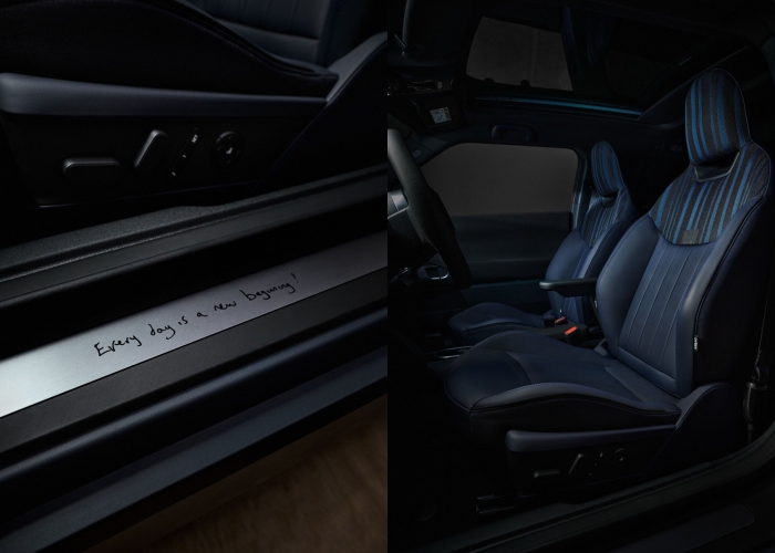 与此同时,车门门槛饰板上印有 Paul Smith 亲笔书写的励志语录“Every day is a new beginning!”(每一天都是新的开始!),特别鼓舞人心;脚垫上绣着他经典的手绘兔子图案,平添了一份童趣风格。在经典的三辐式方向盘上,带有 Paul Smith 标志性多彩条纹的织物饰带,为座舱注入了一抹生动鲜活的色彩,与 Paul Smith 品牌标志相映成趣。