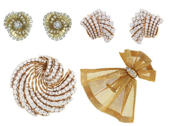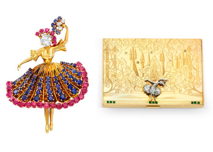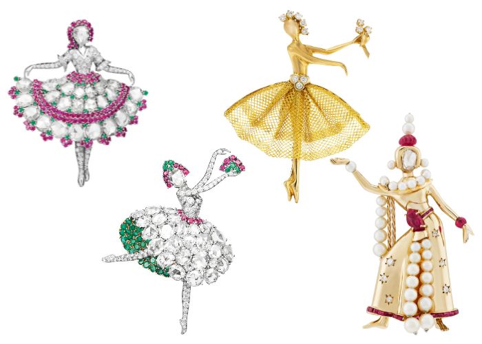 1940年代初,品牌推出了首批芭蕾舞伶胸针(ballerina clips),很快便成为 Van Cleef & Arpels 的标志性设计之一。舞者腾空般的姿态与华美的舞衣,瞬间吸引了无数收藏家的目光。这些舞伶作品通常以黄金或玫瑰式切割钻石打造脸庞,并点缀珍贵头饰。她们身穿芭蕾舞鞋与华丽的短纱裙(tutu),裙身由钻石或彩色宝石镶嵌而成,仿佛随着舞姿轻轻飘动,呼应舞者的优雅动作。