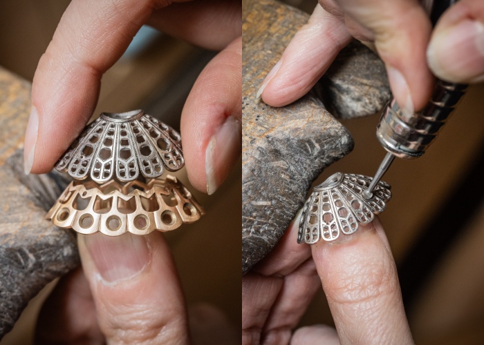 为展现出炫目动人的舞蹈姿态,世家施展了其引以为傲的专业技艺。从绿蜡细意打造开始,这道工序对勾勒舞伶的婀娜身姿起了至关重要的关系,尔后运用蜡模雕塑技艺展现舞伶姿态和舞裙的细腻纹理、细致的手工润饰、抛光、宝石甄选等,都为每一枚舞伶胸针增添流光溢彩。