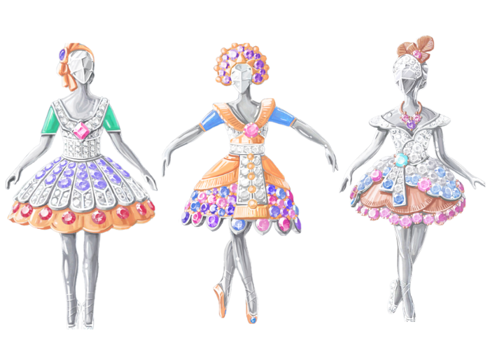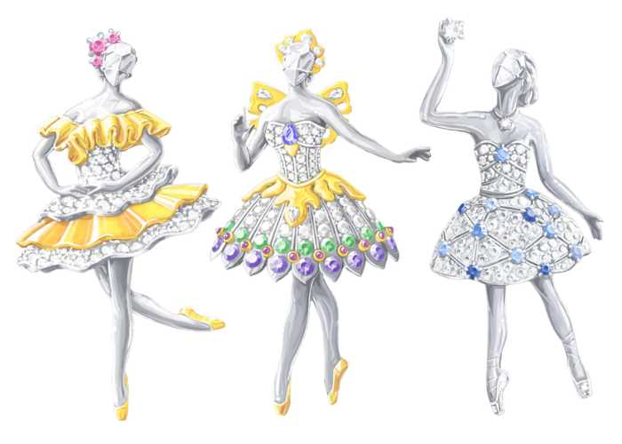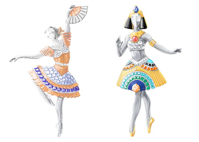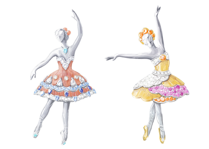 今年,世家再次呈现12款高级珠宝胸针作品,向舞蹈世界敬意。致敬的经典剧目中来自不同流派的芭蕾舞,其中包括现 埃及艳后》(Cleopatra)、《林中仙子》(The Sylph)、《胡桃夹子》(The Nutcracker)等剧目巧妙呼应,芭蕾舞伶纤丽的身姿点缀着设计巧妙、做工精细的舞台服饰。