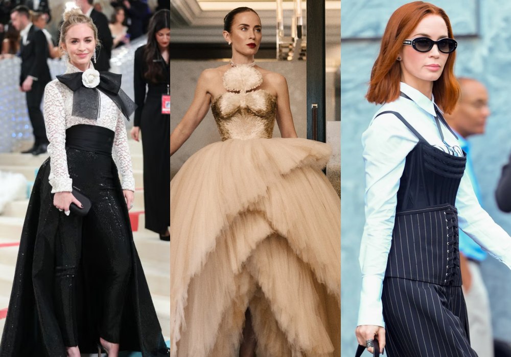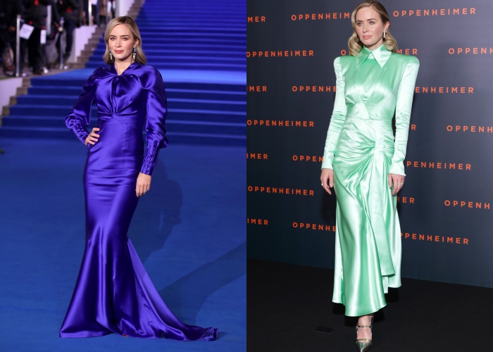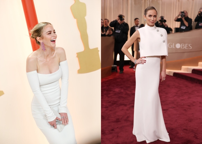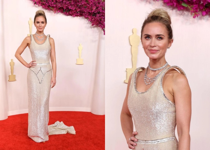 Emily Blunt 很少选择完全随性或松散的礼服。相反,她偏好具有明确结构的设计——例如利落肩线、收腰轮廓,或带有建筑感的剪裁。这样的选择,让她在红毯上始终维持一种挺拔、干净的视觉效果,也自然强化了整体气场。比起柔软却容易失焦的浪漫风,她的轮廓更具存在感,却不会显得用力。