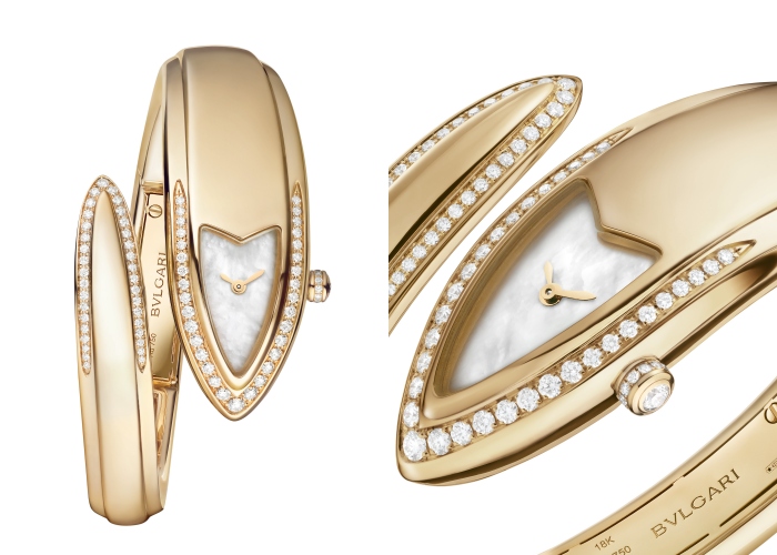 除了彩色灵蛇,Bvlgari也首次以黄色18K金材质勾勒Serpenti Aeterna表款, 少不了璀璨钻石的华丽,选择以流线方式缀于表链两侧,并沿着富有几何张力的灵蛇首尾铺陈,勾勒出简洁流畅的曲线造型。看钻石与表盘上白色珍珠母贝的虹彩柔光交相辉映,成就令人难忘的匠心之作。