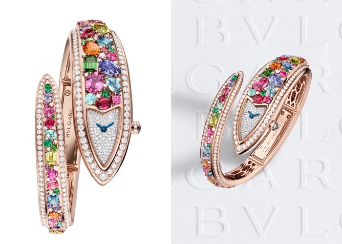 来到Bvlgari这里怎么可以没有灵蛇Serpenti呢?今年续写该经典魅力,带来令人眼前一亮的Serpenti Aeterna系列。品牌精心甄选122颗色泽出众的精美宝石,包括红碧玺、紫水晶、托帕石、祖母绿、黄水晶、蓝宝石、坦桑石、粉红碧玺和帕拉伊巴碧玺、沙弗莱石及橄榄石。圆形切割、明亮式切割、公主方形切割、梨形切割与椭圆形切割等不同切割工艺与尺寸的宝石巧妙排布,方能延展成灵动、闪烁珠宝光彩的整体效果。 采用18K玫瑰金材质,通体镶嵌华美宝石,堪称创意巧思与精湛匠艺深度交融的结晶。整件作品历经225小时的研发设计,185小时的宝石甄选与雕琢,以及逾60小时的精细镶嵌工序;