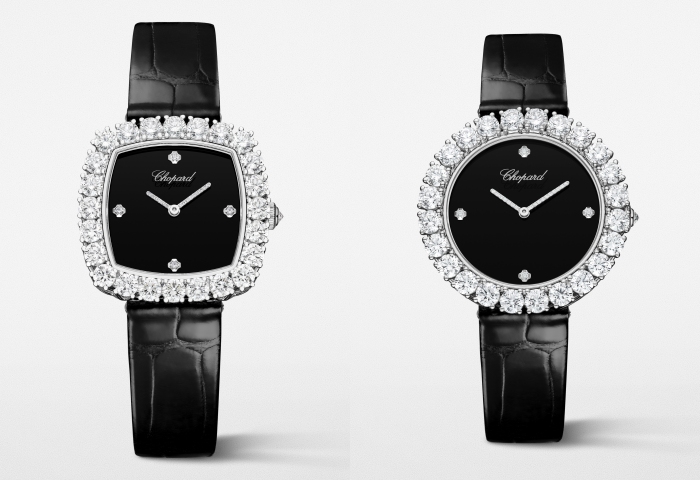 另两款新作则采用深邃迷人的黑色缟玛瑙表盘,一款为枕形表壳,一款为圆形表壳,均饰有明亮式切割钻石时标与白金指针,并搭载 Chopard 09.01-C 自动上链机芯,配衬黑色皮革表带。第四款作品以枕形表壳呈现,搭配灵感源自1960年代家族设计的全新金质凹槽式链节表链,独特纹理一路延伸至表盘,表圈则镶嵌梨形切割钻石,同样搭载 Chopard 09.01-C 自动上链机芯,尽显复古华丽气息。