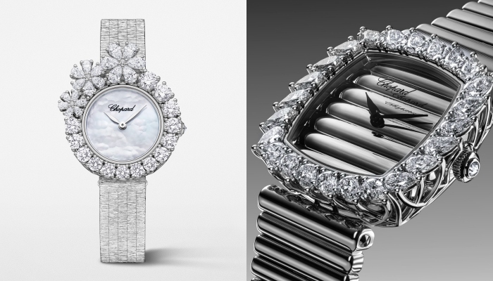 Chopard呈献四款全新 L’Heure du Diamant 时钻诗翩系列腕表,以符合伦理道德标准的18K白金精心打造,并饰以品牌标志性的精湛镶钻工艺表圈,尽显珠宝制表的璀璨魅力。首款作品采用泛着虹彩光泽的珍珠母贝表盘,搭配全新非对称设计表圈,镶嵌以花卉图案排列的钻石,并配上系列标志性的「树皮」纹理表链。腕表搭载 Chopard 10.01-C 手动上链机芯,为同类型机芯中最纤薄之作之一;
