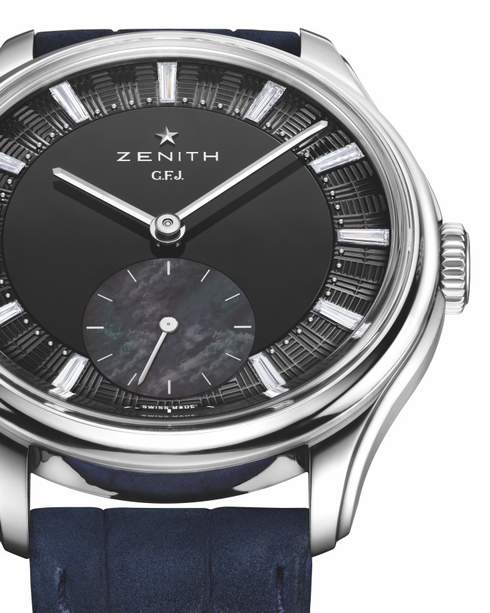 中央圆盘采用黑色缟玛瑙材质,带来仿若液体表面般的抛光质感。超大小秒盘位于6时位置由灰色珍珠母贝打造。玑镂砖纹图案环绕表盘,灵感源自ZENITH制表工坊的建筑外立面,构筑出精美鲜明的轮廓。11颗长阶梯形切割钻石时标点缀表盘,与白金指针交相辉映,匠心的布局缔造出均衡和谐之美。透过蓝宝石水晶底盖,可见机芯饰以日内瓦波纹、手工倒角表桥和深钌色饰面,与沉稳的钽金属表壳互相辉映。G.F.J. in Tantalum腕表限量发行20枚。