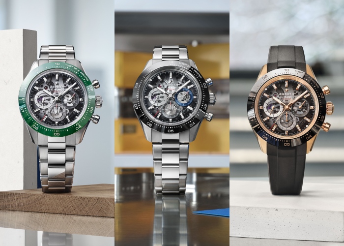 ZENITH CHRONOMASTER SPORT SKELETON镂空款腕表备有四种款式,其中两款采用精钢材质:一款绿色陶瓷表圈搭配灰色计时盘;另一款采用黑色陶瓷表圈搭配标志性的灰色、岩灰色和蓝色三色计时盘,两款腕表均配以三链节精钢表链和另附一条橡胶表带。第三款腕表以 18K 玫瑰金打造,搭配黑色陶瓷表圈和黑色橡胶表带。最后便是压轴力作,限量10枚的玫瑰金独家款式,搭配金质表链,表圈镶嵌50颗长方形切割钻石华丽呈现。